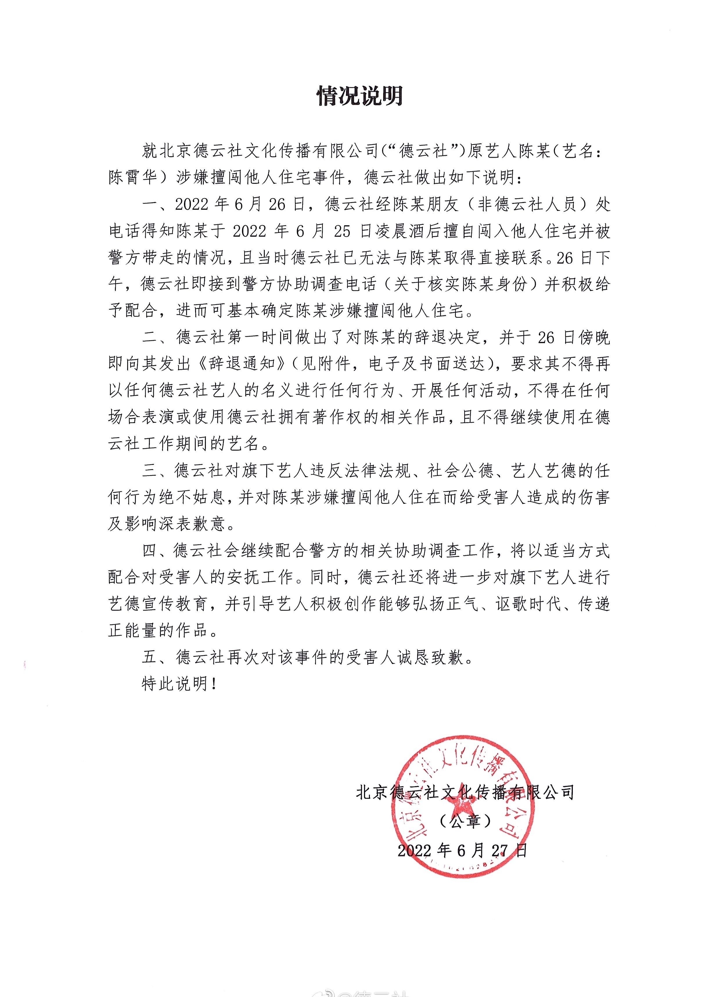 此事曝光后,德云社迅速发布声明,将陈霄华除名,并向女房主道歉,可依旧难以挽回影响。