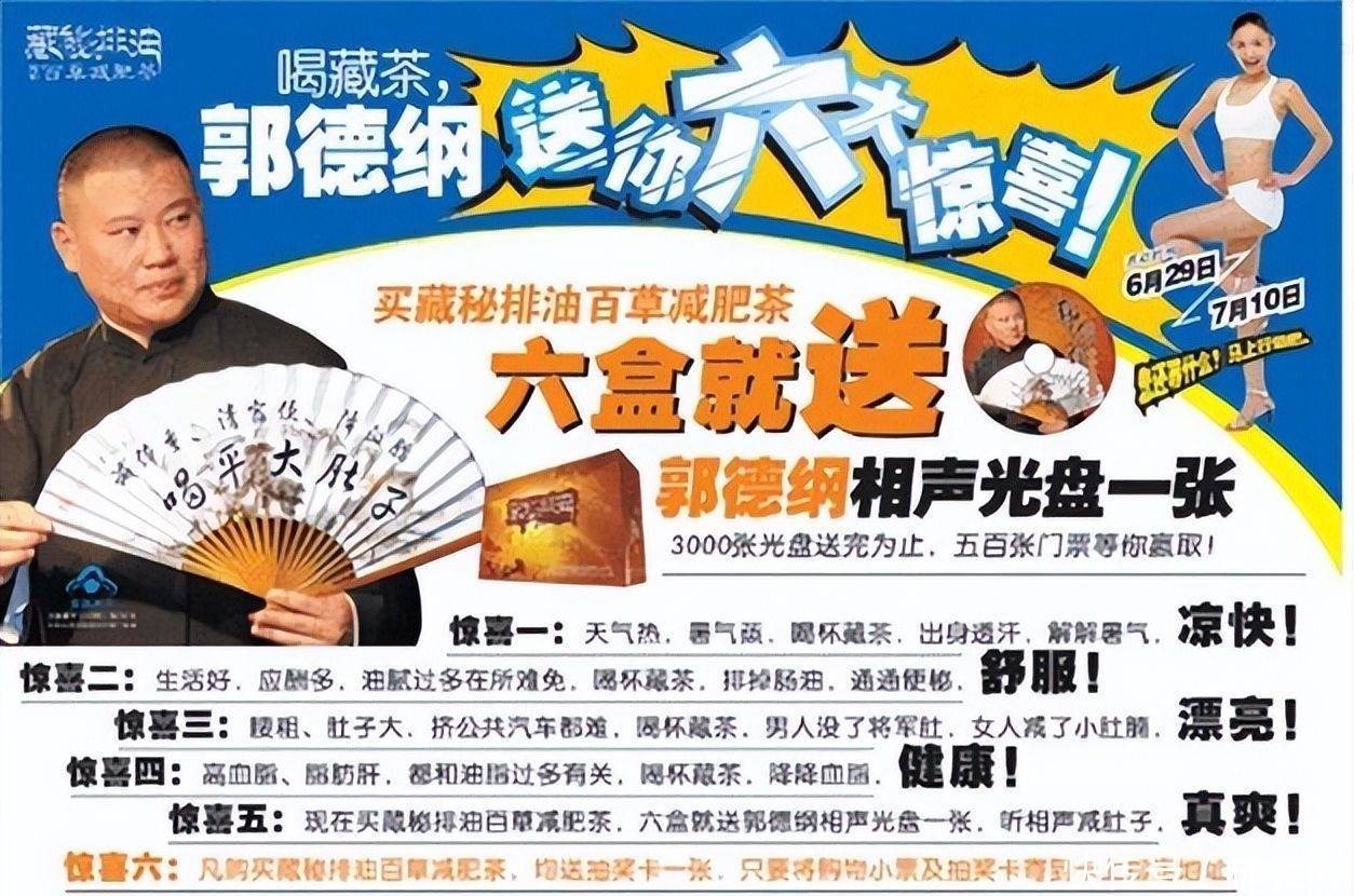 2007年,郭德纲代言一款减肥茶,广告中吹得神乎其神,声称喝几天就能瘦好几斤,不少百姓信了他的名气纷纷购买,结果喝了不仅没效果,还有人出现肠胃不适。